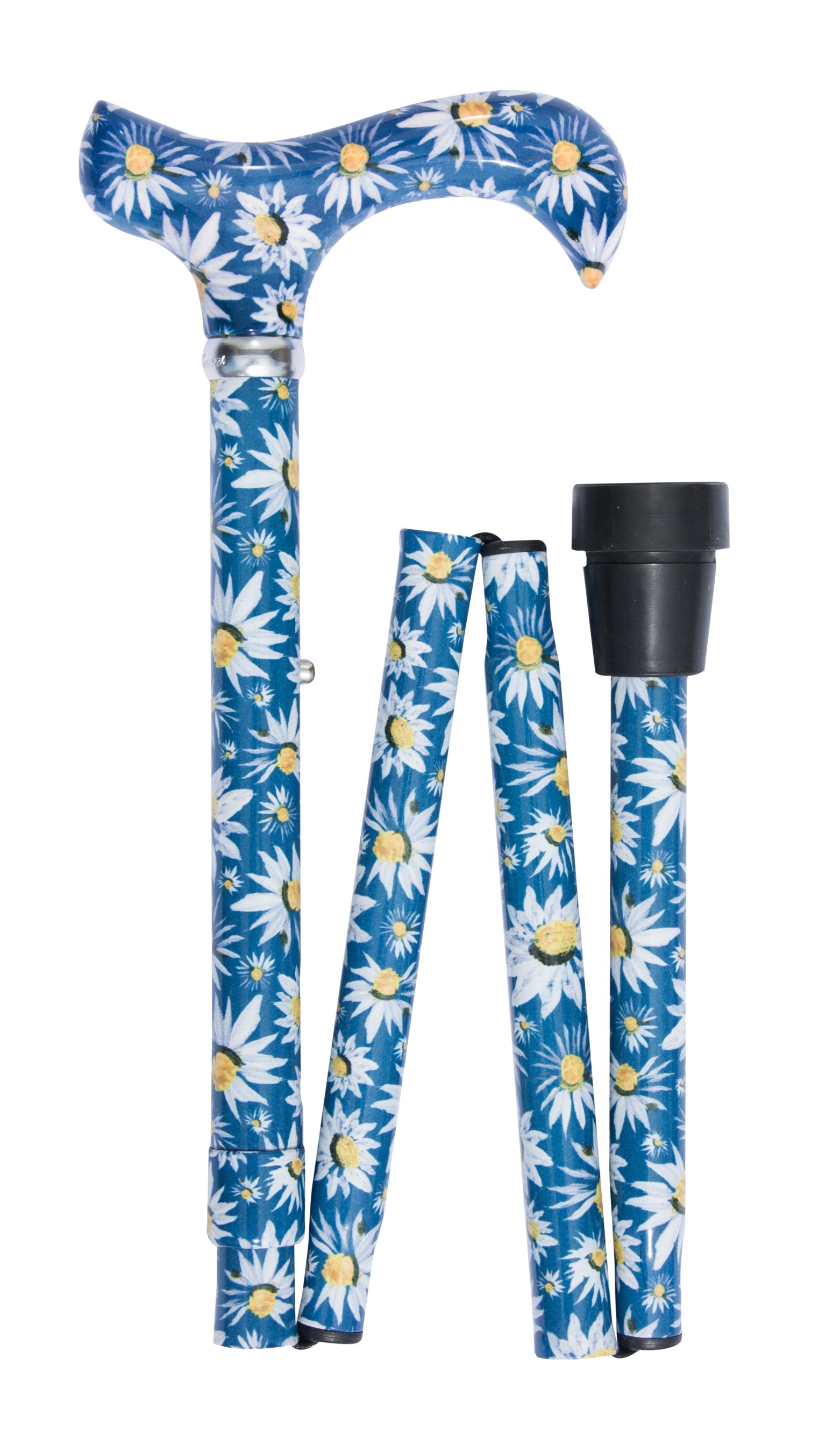 A smart height-adjustable folding derby featuring a stylish print of watercolour daisies. The simple daisy is one of Britain's best-loved wildflowers. The flower name comes from the Old English word dægeseage, meaning "day's eye". The cheerful white and yellow daisies are shown on a cool blue background. This folding walking stick is height-adjustable from 79 to 89cm (approximately 31 to 35"), making it suitable for a wide variety of users. It is fitted with a chrome collar and a black, non-slip rubber ferrule. Item weight 315g. Ferrule diameter 19mm.