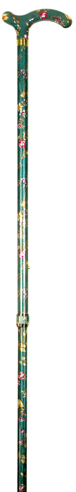 An extremely popular contemporary walking stick, often bought as a present or as an accessory for a particular outfit. The charming pattern features little flowers in various shades of pink, lavender and yellow on a soft green background. The strong and lightweight aluminium shaft can be extended in 2.5cm increments from 67cm to 90cm (approximately 26”-35.5”). The pattern is applied to both the shaft and the handle, and the Chelsea cane is fitted with a neat brass collar and a rubber ferrule. The petite handle is easily held by people with smaller hands. Ferrule diameter 16mm. Item weight is 260g.