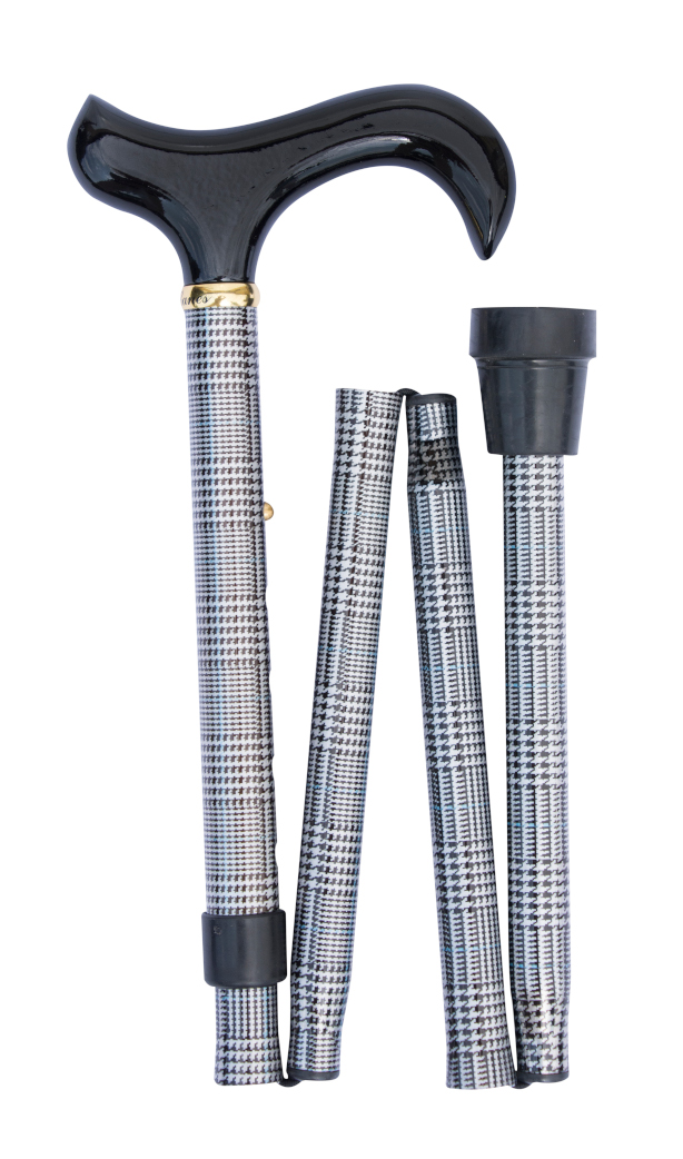 An elegant folding cane for the sartorially-minded walking stick user. Fitted with a black wood derby handle, this aluminium cane features a very smart black and silver Prince of Wales check with a faint pale blue stripe. The Prince of Wales check was designed by the British king Edward VII when he was Prince of Wales and later popularised by his well-dressed grandson the Duke of Windsor when he in turn was Prince of Wales. The Prince of Wales check is a great favourite among suave British men and is redolent of the fine tailoring of Londons Savile Row. This folding cane is adjustable between 85 and 95cm, making it suitable for a wide range of users. Weight 345g. Ferrule size 19mm.