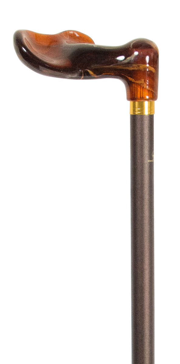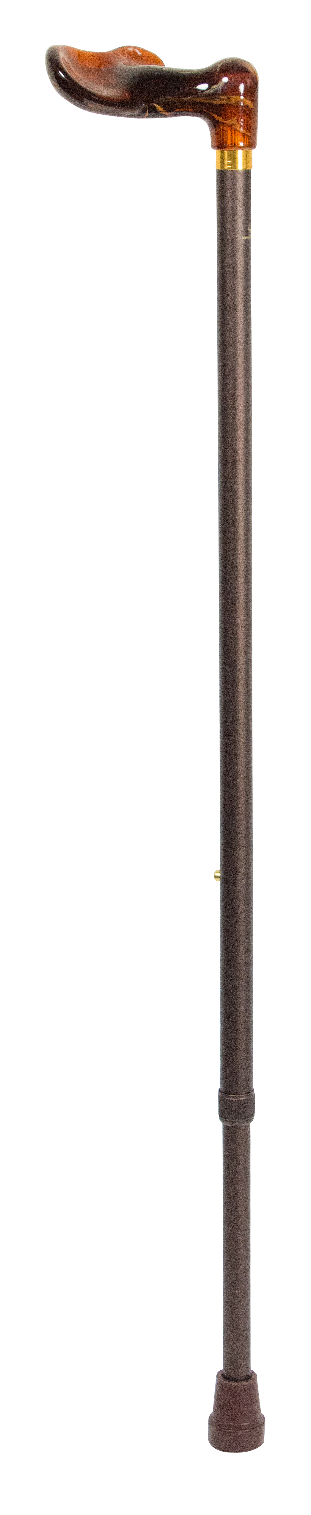A very smart version of the practical orthopaedic stick with supportive Fischer handle. The handle design in imitation amber spreads the users weight across their palm, which many sufferers of arthritis and rheumatism find of great benefit and comfort. The brown, anodised aluminium shaft is adjustable in height from 77 to 102cm, making it suitable for a wide range of users. It is fitted with a non-slip brown rubber ferrule. Item weight 440g. Ferrule diameter 19mm. Also available in a left handed version to make a pair.