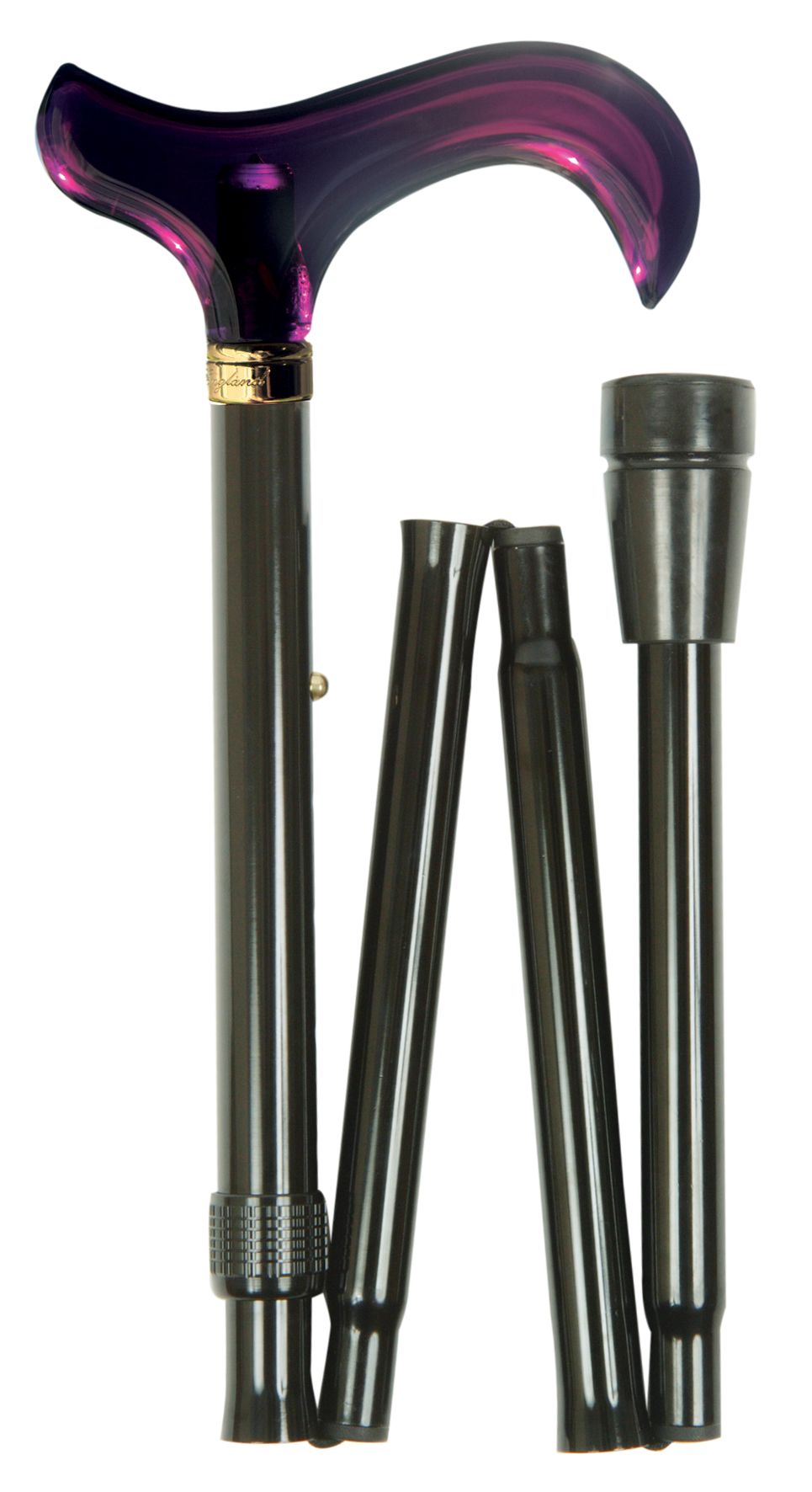 A very smart folding cane suitable for everyday use. The supportive derby handle is made from smooth acrylic which is very pleasant to hold and semi-translucent amethyst purple in colour. The handle is convenient to hook over the arm when the stick is not in use. The black aluminium shaft is both lightweight and very strong, and is height adjustable between 82-92cm (approximately 32”-36"). The folding cane is fitted with a smart, metal collar and a non-slip rubber ferrule. Ferrule diameter 19mm. Item weight is 425g.